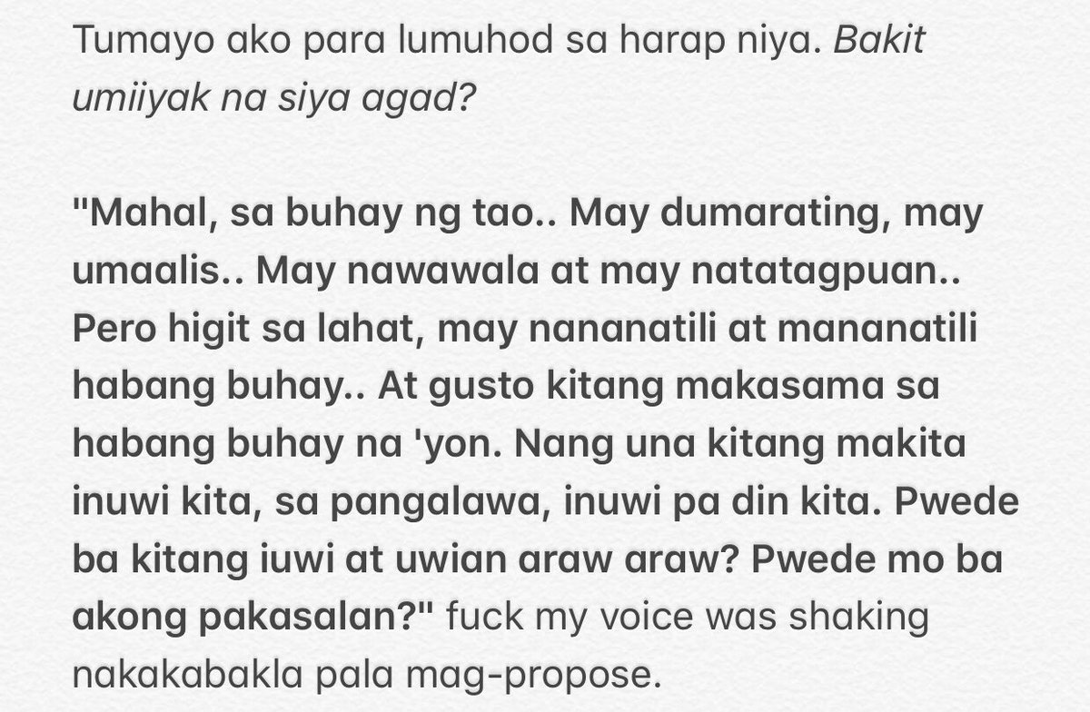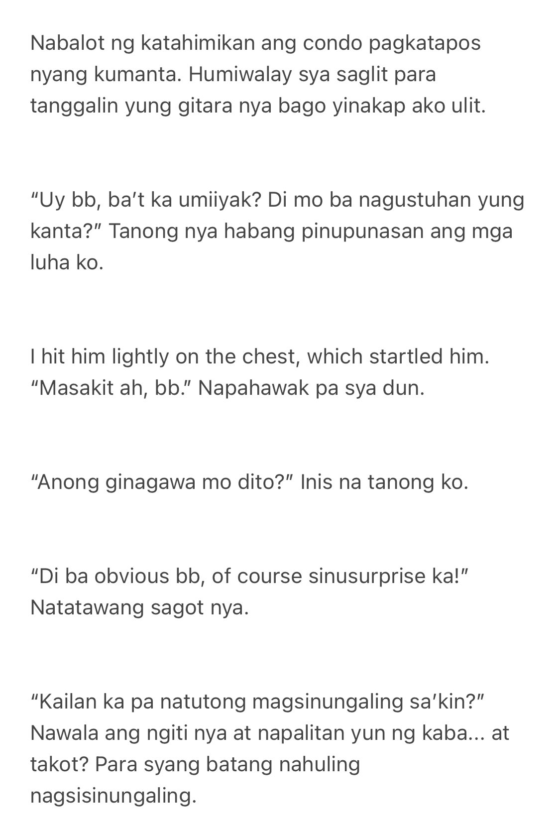 Umiiyak ako kasi miss na kita in english. Miss you ive missed you. Umiwas ako ng tingin kasi nakatingin ka sa kin at dumeretso na lang ako sa iba nating friends dun sa kabila. Ang cold mo sa kotse.